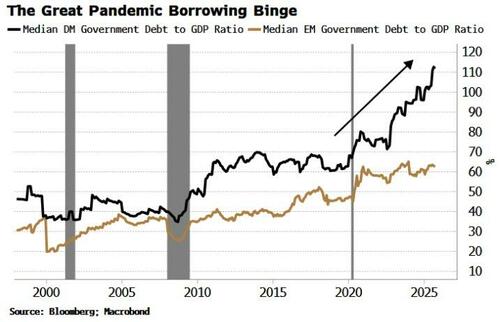 自那以后,没有哪个发达市场政府认真尝试扭转这一局面,顺周期的财政宽松政策目前已在发达市场中根深蒂固。其结果是债务与GDP比率大幅攀升,与新兴市场国家的相对克制反倒形成鲜明对比。