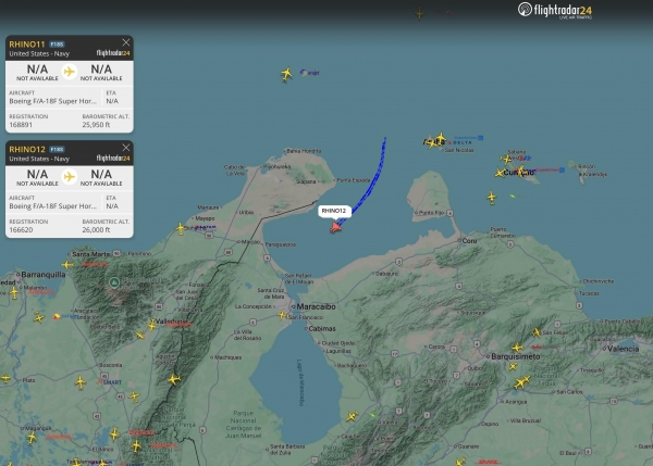 这两架呼号为"犀牛11"和"犀牛12"的美国海军舰载机飞行高度约7620米,距离委内瑞拉第二大城市马拉开波东北不到161公里,之后向北飞行离开了该地区 。从FlightRadar24等网站的飞行轨迹能看到,战机在委西北部的马拉开波湖北部上空飞行,还飞越了委内瑞拉湾水域,飞行路线刚好处于委内瑞拉苏利亚州、法尔孔州这两个能源产业关键地区之间 。