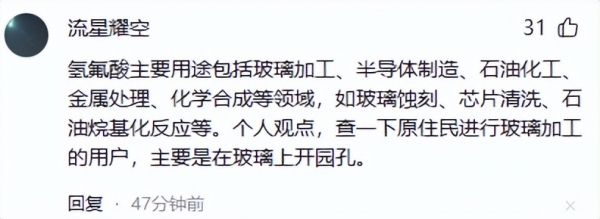 结合以上网友们透露出来的信息,这个物质的用途大多用在化学方面或者金属和玻璃加工上。