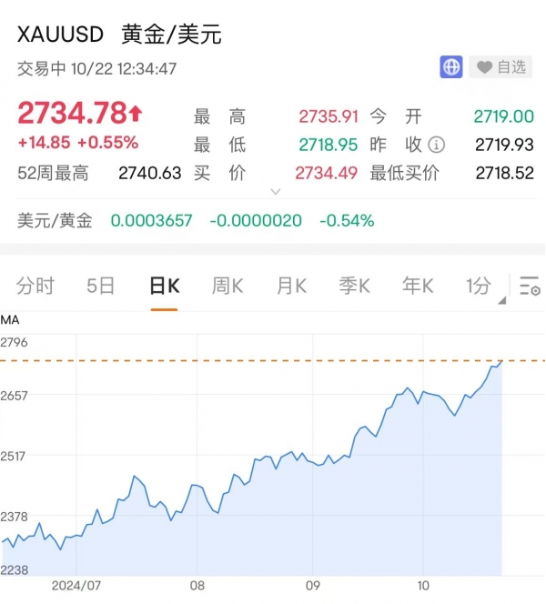 北京时间10月21日(周一)晚间,美元计价黄金价格一度触及2740.52美元/盎司,创历史新高。道琼斯市场数据显示,年初至今,最活跃的黄金合约价格已创下35次历史新高,这是自2011年创下38个历史新高以来的最高纪录。