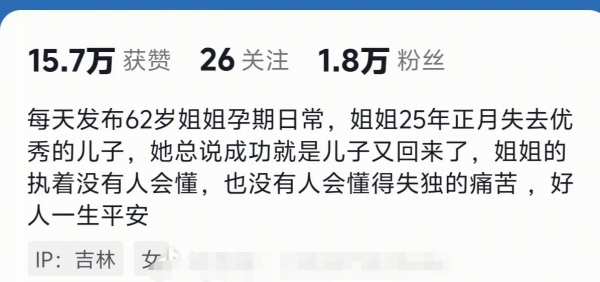 而且60岁以上高妊娠的新生儿存活率不足60%。如果孩子出现什么意外,对她来说又是双重打击呀。翻开她的社交账号,目前有4万多粉丝在关注。