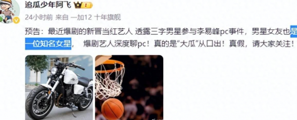 就在大家还没有缓过神的时候,狗仔又开始了新一轮的爆料,而且还是直接预告了一个终极大瓜,这个终极大瓜的主人虽然是李易峰,但是却没有曝光的是他的朋友,而且还是机车与篮球,以及新晋当红艺人这几个关键词,让很多人都开始揣测到底是谁会在其中。