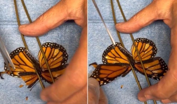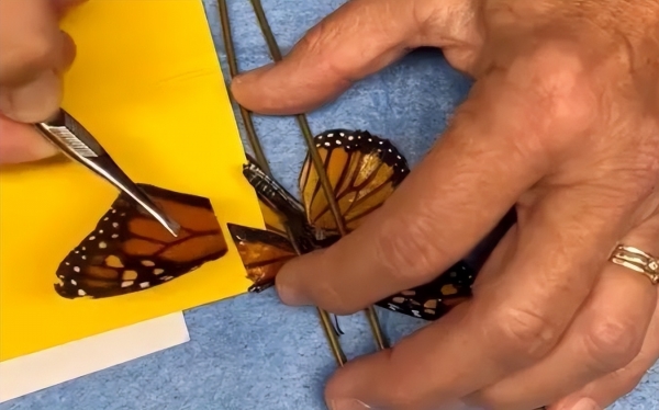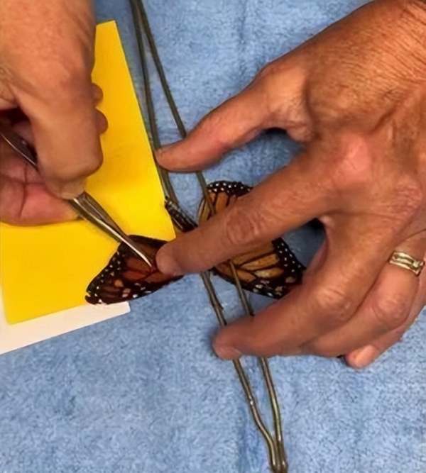 本迪克森跟助手用一根铁丝折弯固定住了帝王蝶,不然压根按不住它,谁也不想在手术途中听到清脆的声响。然后她们在手上拍一些玉米淀粉,防止手汗影响操作或者将帝王蝶的鳞粉给搞光光。