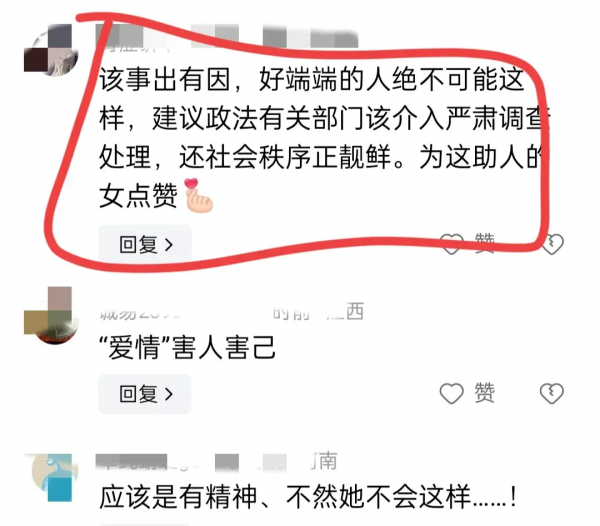 还有网友说:该事出有因,好端端的人绝不可能这样,建议政法有关部门该介入严肃调查处理,还社会秩序正靓鲜。为这助人的女点赞!