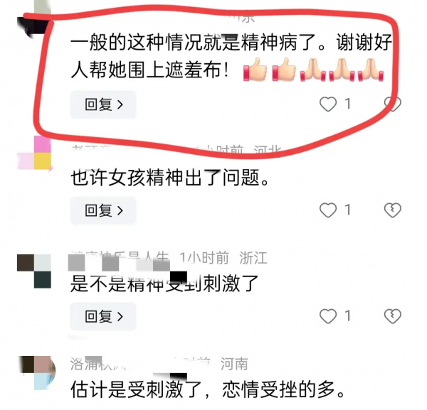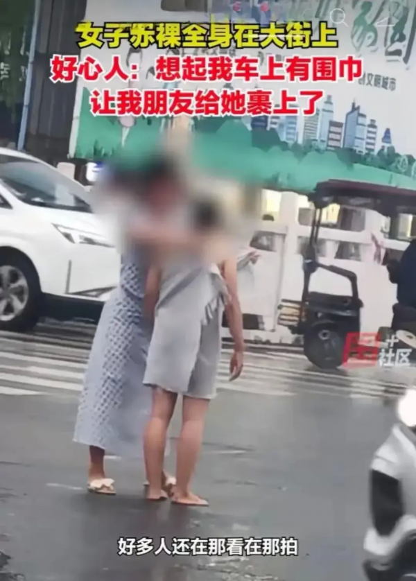 网友说:一般的这种情况就是精神病了。谢谢好人帮她围上遮羞布!