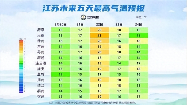 3月20日20时至3月21日20时,全省多云到晴。最高温度:全省16℃左右;最低温度:西北部和苏南地区4~5℃,江淮之间东部地区1℃左右,其他地区2~3℃。全省偏东风4级左右。