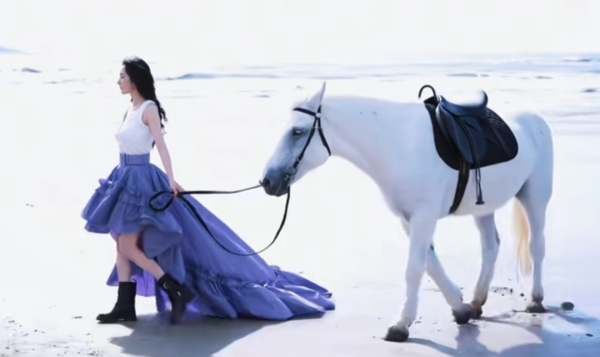 此次封面由氛围感大师张家诚掌镜,取景海南三亚海岸,杨幂身着Prada 2026春夏全球首曝新装,跨骑白马驰骋于沙滩之上。银线浪纹缀满四千颗碎钻的定制礼服随风翻飞,改造款Valentino红鞋沾着细沙暗藏环保巧思,连白马鬃毛都编进银丝线,每一处细节都尽显顶奢与顶流的双向奔赴。镜头前的她时而策马迎风眼神笃定,时而静立听浪松弛慵懒,将"云淡风轻的神性美"演绎到极致,柔中带飒的反差感堪称时尚表现力天花板。