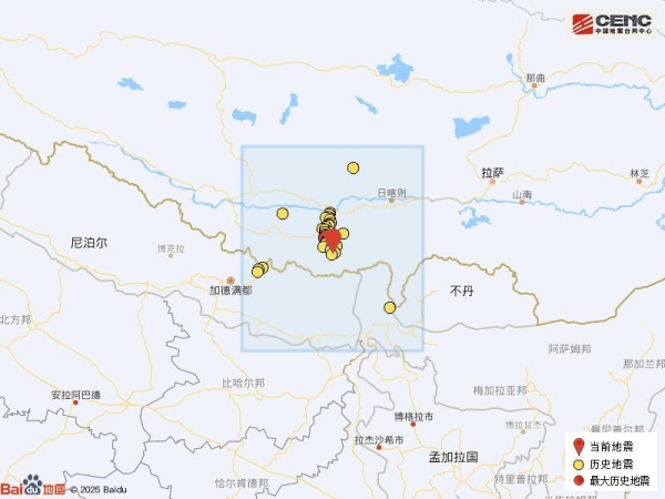 历史地震:根据中国地震台网速报目录,震中周边200公里内近5年来发生3级以上地震共109次,最大地震是2025年1月7日在西藏日喀则市定日县发生的6.8级地震(距离本次震中21公里),按震级大小前50次历史地震分布如图。