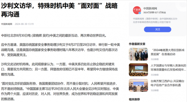 信息来源:中国新闻网 2024-08-30--《沙利文访华,特殊时机中美"面对面"战略再沟通》