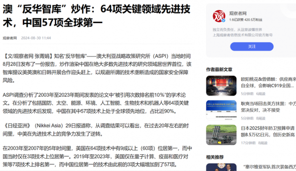 信息来源:观察者网 2024-08-30--《澳"反华智库"炒作:64项关键领域先进技术,中国57项全球第一》