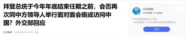 信息来源:北京商报 2024-08-29--《拜登总统于今年年底结束任期之前,会否再次同中方领导人举行面对面会晤或访问中国?外交部回应》