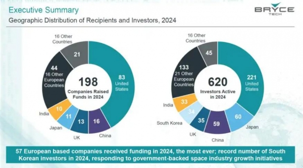 根据BryceTech发布的《2025商业航天投融资报告》显示,2024年商业航天被投企业的地域分布上,美国以83家被投企业为全球冠军,欧洲以57家位列全球第二,中国以16家企业居第三。三大区域拿下全球近9成的融资金额。