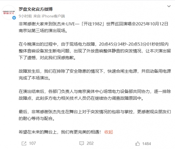 13日凌晨,主办方罗盘文化发文:非常感谢大家来到张杰未·LIVE-「开往1982」世界巡回演唱会2025年10月12日南京站第三场的演出现场。在今晚演出的过程中,由于现场电力故障,20点45分34秒-20点53分01秒时段内整体音响设备发生断电问题,出现了外放音响整体静音的突发情况,让本次演出留下了遗憾,对此我们深感抱歉。