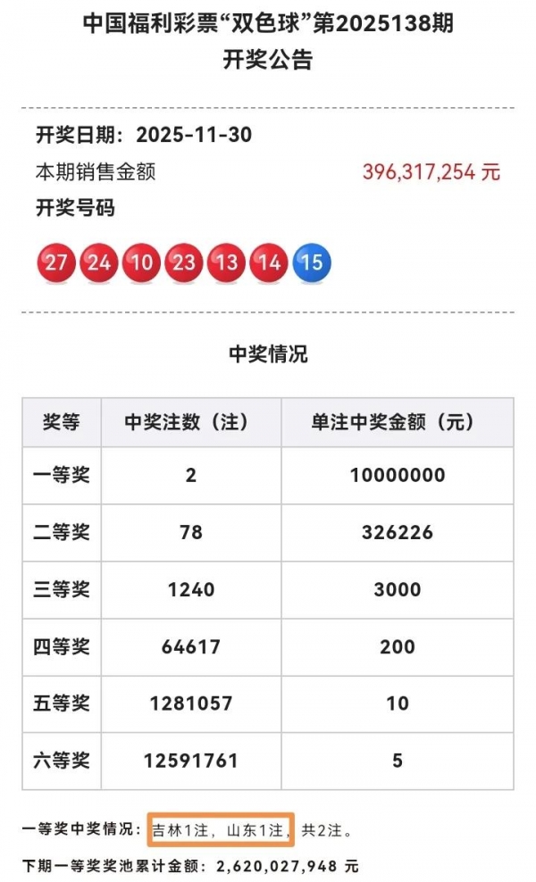 大家好!双色球2025138期于11月30日正常开奖,本期只有2注一等奖,花落吉林和山东,太幸运了,恭喜恭喜!