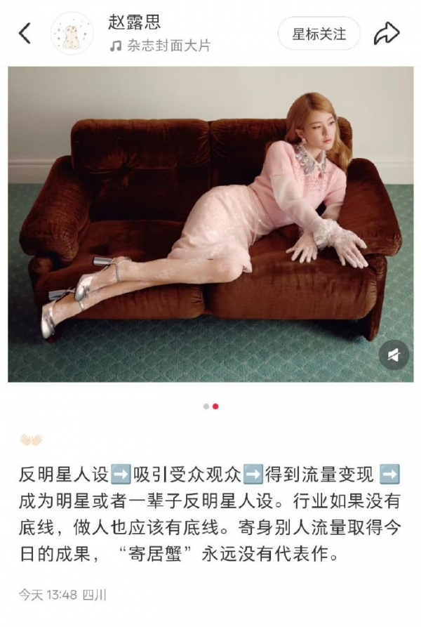 事实上,赵露思的"疲惫宣言"背后,还藏着一个更尖锐的问题,有网友质疑她现在到底算演员还是网红?尽管她多次批判娱乐圈"流量寄生"现象,甚至用"寄居蟹"讽刺靠炒作上位的同行,但自己却长期未进组拍戏,反而频繁现身直播间。