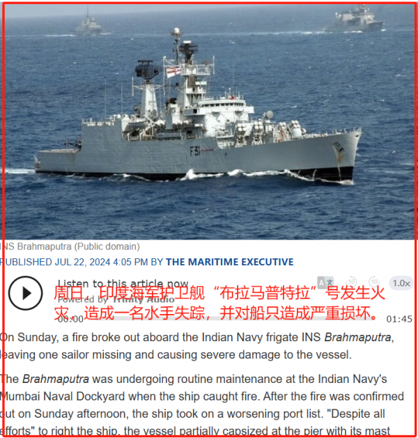 说来真是让人唏嘘。7月22日当天,印度海军的"布拉玛普特拉"号护卫舰在孟买造船厂里突然翻了个底朝天。这可不是一艘普通的小船,而是排水量高达3850吨的大家伙,属于印度海军的主力舰艇呢。