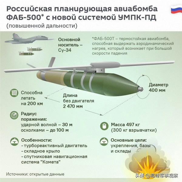 俄军连日来在北顿涅茨克、扎波罗热、赫尔松、哈尔科夫等方向连续突破。俄军的战果主要得益于空中火力的增强,一方面用于前线战术轰炸的苏-34战斗轰炸机数量扩大到340架以上。俄军地面部队在进攻中受阻时,随时可以召唤空中火力支援。另一方面,俄军方进一步改进了FAB系列精确制导炸弹,给滑翔航弹安装了小型涡喷发动机,使FAB-500航弹的射程翻了一倍,提高到200公里。
