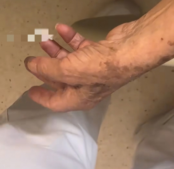 低头一看,发现老人布满老年斑的手正贴着自己的裤子,还在不停磨蹭。感觉被冒犯的护士当即拿出手机拍下了后续的几秒画面作为证据。