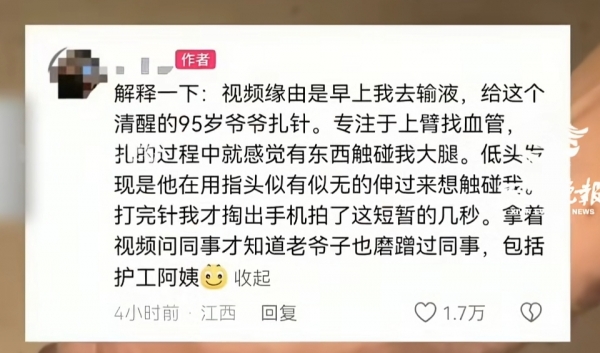 视频内容是护士正在给一位95岁的大爷扎针,过程中感觉大腿被反复触碰,之后用手机拍下了这一幕,事后才从同事和护工口中得知,她们此前也遭遇过类似的冒犯。