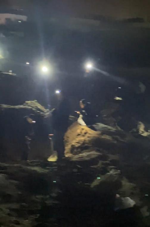 另一视频显示,天色已晚,现场很多人打着灯光,仍在挖掘。一旁有警车到场。