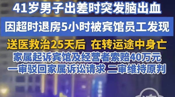 41岁男子出差时,花48块钱住了一家旅馆,押金50元。第二天退房时间到了,不见他人,店员以为他要续住,也就没在意,谁知过了5个小时,还不见动静,店员意识到不对劲,马上报警。进入房间后竟发现男子一动不动倒在地上,送医后发现是脑出血。治疗25天不见好转,转院路上,男子不幸去世。这下家属不干了,一纸诉状将旅馆告上法庭,索赔40万。