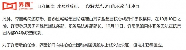 11日,《每日经济新闻》记者从知情人士处获悉,10月10日娃哈哈集团召开董事会,除了通过宗馥莉辞职事项外,还任命许思敏为娃哈哈集团总经理,董事长职务空缺。