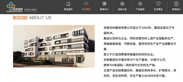 官网资料显示,宏胜集团有限公司成立于2003年,最初为娃哈哈的代工厂。公司以饮料为主业,同时经营饮料上游产业链配料生产、高端装备制造、印刷包装,提供饮料生产全产业链解决方案。