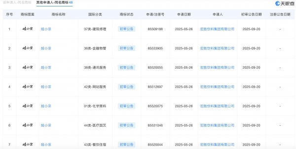 天眼查显示,多枚"娃小宗"相关商标已被申请注册,申请人为【宏胜饮料集团有限公司】,申请日期为2025年5月,国际分类涵盖食品、啤酒饮料、方便食品等多个品类。