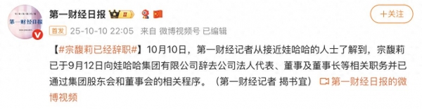 据报道,宗馥莉已于9月12日从娃哈哈离职。