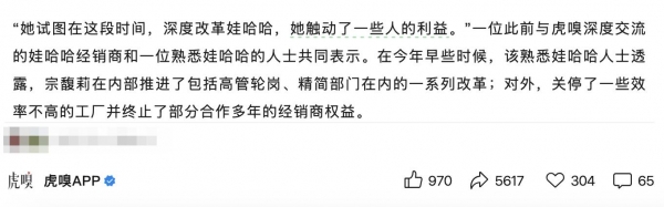 据虎嗅消息,有娃哈哈经销商和一位熟悉娃哈哈的人士共同表示,宗馥莉在任这段时间,曾试图深度改革娃哈哈,触动了一些人的利益。