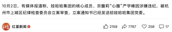 一名消息人士表示,宗馥莉此次辞职,是因为商标使用"不合规",宗馥莉决定经营自己的品牌"娃小宗"。