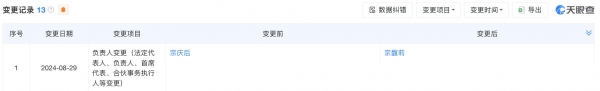 天眼查显示,2024年8月29日,【杭州娃哈哈集团有限公司】的法定代表人由宗庆后变更为宗馥莉,同时宗馥莉担任董事长兼总经理职务。