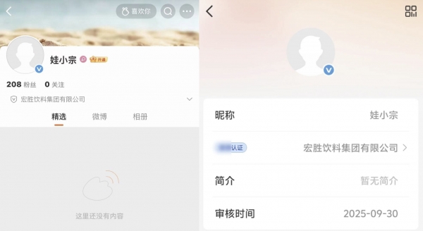 天眼妹注意到,"娃小宗"微博账号已注册,认证主体为宏胜饮料,审核时间为9月30日。