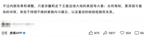 据虎嗅分析,宗馥莉离职的深层原因或许是持续不绝的家族内斗疑云、以及复杂的娃哈哈股权关系。