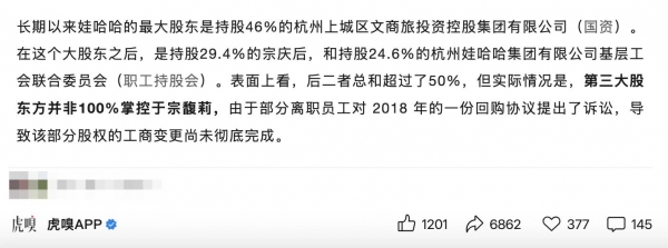 表面上看,第二、第三股东持股总和超过了50%,但实际情况是,第三大股东方并非100%掌控于宗馥莉,由于部分离职员工对 2018 年的一份回购协议提出了诉讼,导致该部分股权的工商变更尚未彻底完成。