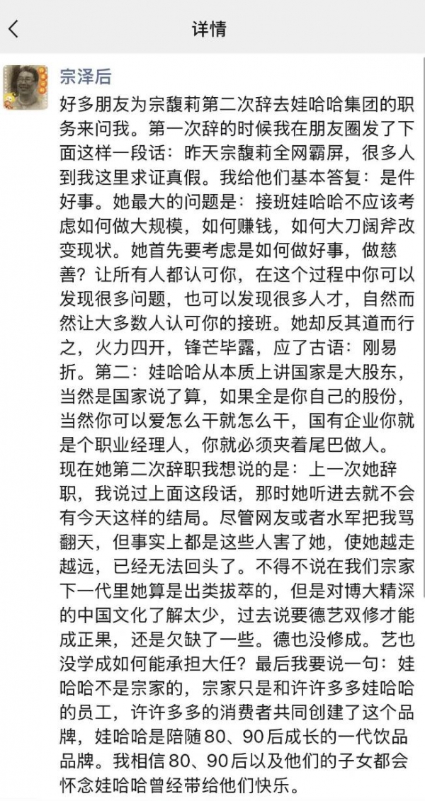 此外,据第一财经消息,11日,宗馥莉的叔叔宗泽后也在朋友圈对宗馥莉离职的事情发表观点,他称:宗馥莉最大的问题是,接班娃哈哈不应该考虑如何做大规模,如何赚钱,如何大刀阔斧改变现状。她首先要考虑是如何做好事,做慈善。