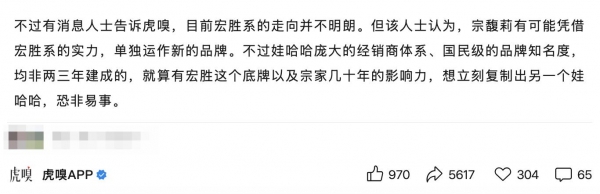 有知情人士透露,宗馥莉有可能凭借宏胜系单独运作新的品牌,不过想复制出另一个娃哈哈,恐怕并非易事。