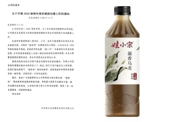 此前,一份《关于开展2026销售年度经销商沟通工作的通知》显示,自娃哈哈集团创始人离世后,公司一直努力推进解决各项历史相关遗留问题,为维护"娃哈哈"品牌使用的合规性,公司决定从2026年新的销售年度起,更换使用新品牌"娃小宗"。