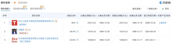 天眼查显示,娃哈哈股权呈现三方制衡的格局,宗馥莉为第二大股东,持股29.4%,此外,杭州市上城区文商旅投资控股集团有限公司(国资)持股46%,基层工会(职工持股会)持股24.6%。