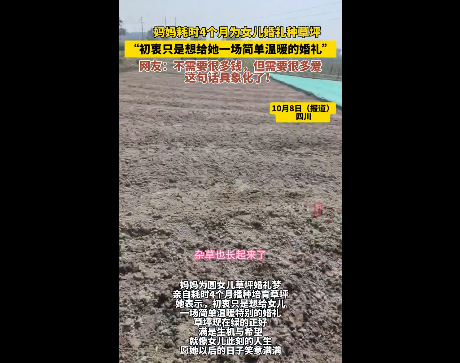 10月8日(报道时间),四川一位暖心妈妈为圆女儿草坪婚礼梦,亲自耗时4个月播种培育草坪。"从空地到草坪到婚礼,算是妈妈送给你的新婚礼物吧! "她表示,初衷只是想给女儿一场简单温暖特别的婚礼。草坪现在绿得正好,满是生机与希望,就像女儿此刻的人生,愿她以后的日子笑意满满。网友:不需要很多钱,但需要很多爱,这句话具象化了!