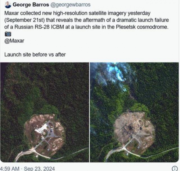 这个消息是路透社曝光的,该媒体发布了一张卫星照片。显示俄罗斯北部的普列谢茨克航天发射场的发射井,出现一个约 62 米宽的弹坑,周围区域遭到严重破坏。而本月早些时候拍摄的图像显示,发射井没有受到任何明显破坏。