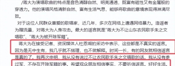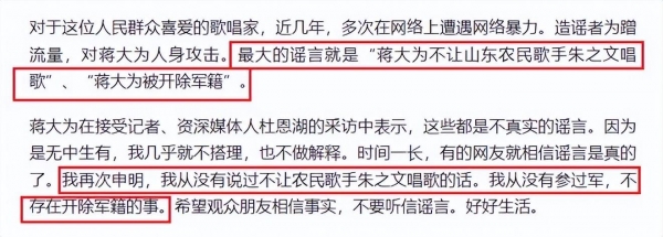 近日,让著名歌唱家蒋大为再度深陷重围的,恰恰就是这无休无止的谣言之祸。 "蒋大为被开除军籍"、"蒋大为不让农民歌手朱之文唱歌",这些看似劲爆的标题,却无一不是无中生有、以讹传讹的坊间谎言。