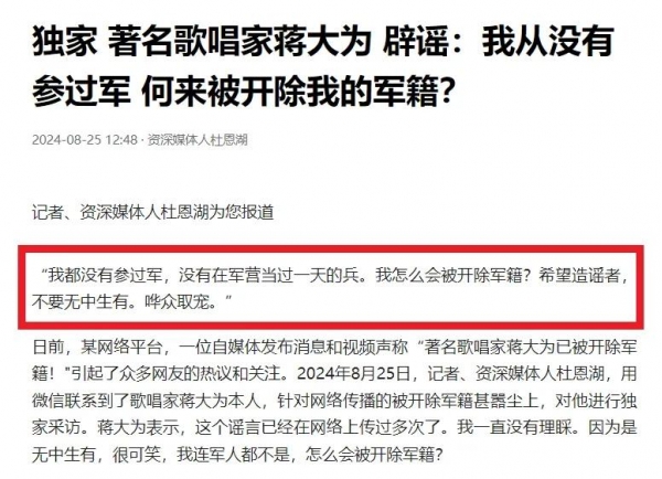 蒋大为直言,自己从未参过军,更不存在所谓的被开除一说,这些不过是造谣者为了"抓眼球"、"博关注"而编织的鬼话连篇。一个再简单不过的事实,硬是被复杂化、异化成令人"咋舌"的传闻。