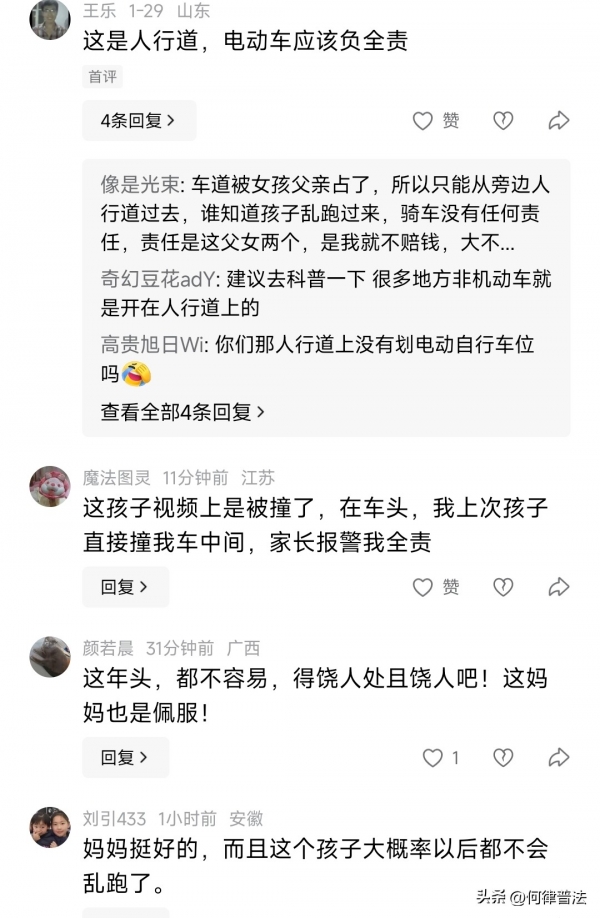 也有不少网友表示:这孩子视频上是被撞了,在车头,上次孩子直接撞我车中间,家长报警我全责!这是人行道,电动车应该负全责