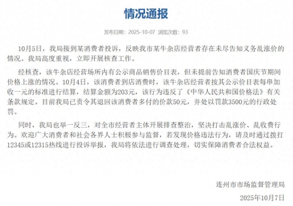 经核查,该牛杂店经营场所内有公示商品销售价目表,但未提前告知消费者国庆节期间价格上涨的情况。10月4日,该消费者到店消费时,该牛杂店经营者按其公示价目表每串加收一元的标准进行结算,结算金额为203元,该行为违反了《中华人民共和国价格法》有关条款规定。目前我局已责令其退回该消费者多付的价款50元,并处以罚款3500元的行政处罚。