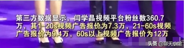你更想不到,闫学晶一条20秒的广告就能赚10万,一条1分钟的广告能赚12万。
