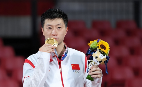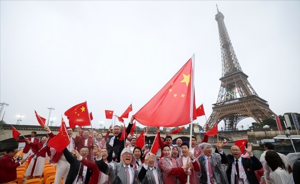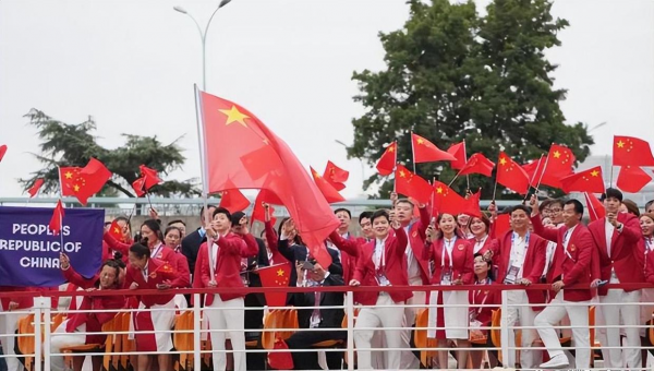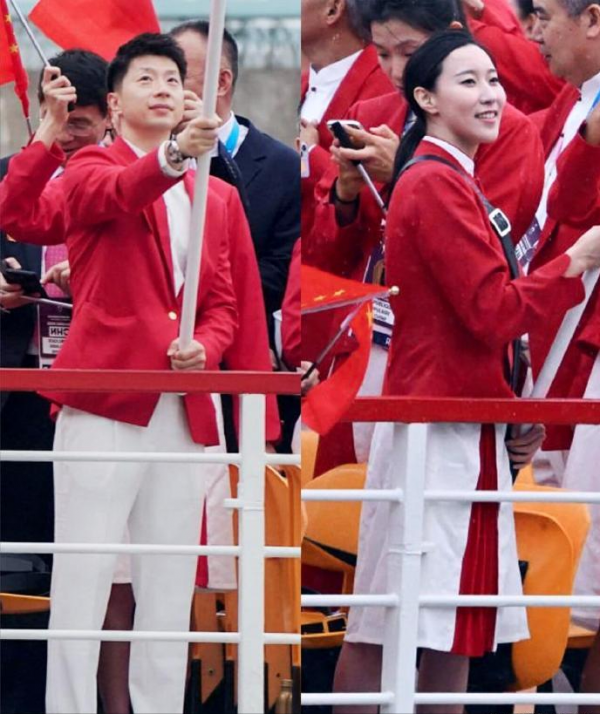 塞纳河畔,一抹红光闪耀。马龙和冯雨担任旗手,高举手中的国旗,挥舞出激动人心的画面。