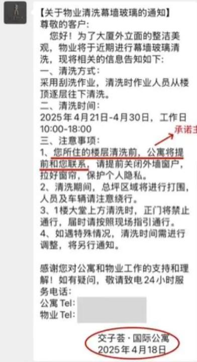 今年4月份,公寓管家发私信提醒妻子,将有高空作业工人对公寓外墙进行清洗,并承诺工人清洗到她们家这一层的时候,会提前发消息通知她们拉上窗帘保护隐私。