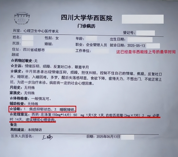 程先生带她前往医院,被诊断出焦虑、抑郁,还有睡眠障碍。