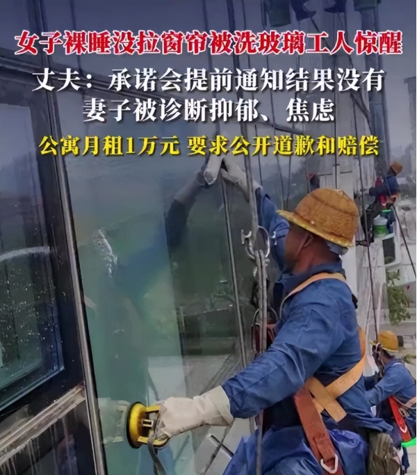 夫妇俩没提前接到任何提醒,妻子照常在家裸睡,卧室床正对着落地窗,没有拉窗帘,玻璃是透明的,室内还开着灯,没穿衣服睡觉的妻子在睡梦中被窗外高空作业的声音惊醒。